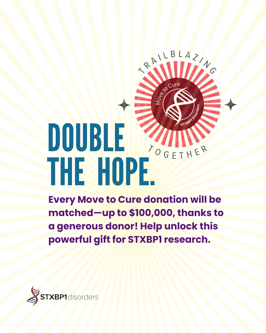 You’re not just fundraising — you're trailblazing a path toward a cure for STXBP1 disorders. Whether your event is big or small, your efforts are part of something bigger — and we’re so grateful to have you on this journey.